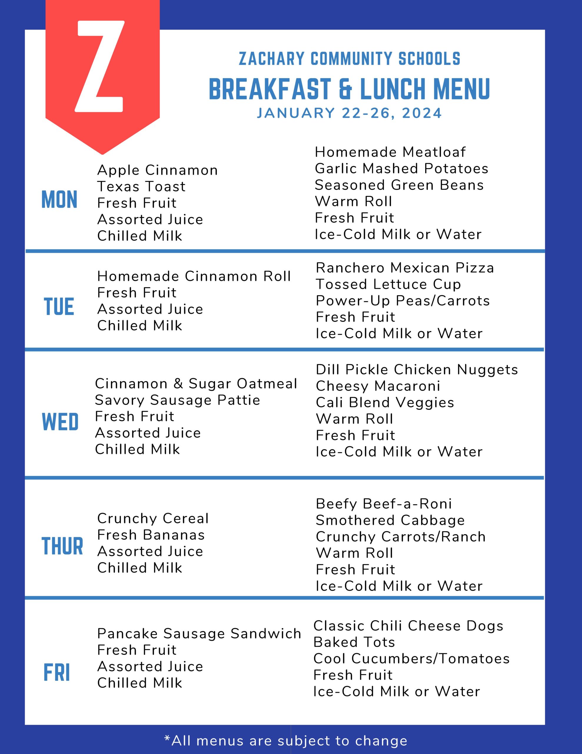 Menus โ Zachary Community School District
